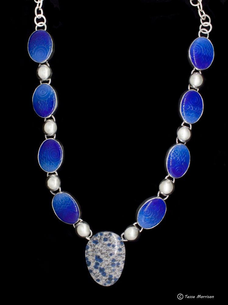 This central stone in this necklace is a beautiful piece of blue Jasper surrounded by eight oval Basse Taille enamels on pure silver. The blue enamel is vibrant and the pattern under the enamel glow. The settings, chain and domes are sterling silver. The length is adjustable, from 44 mm to 54 mm but it can be made longer or shorter if required. The model wearing the necklace is life-size to the scale of the necklace. This necklace is unique and completely handcrafted (with the exception of the catch) and uses the highest quality material.