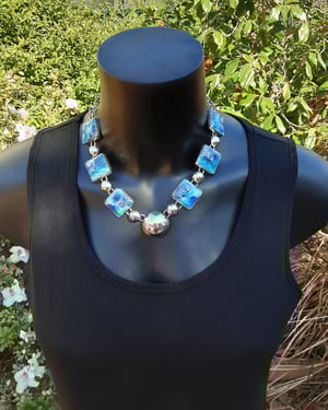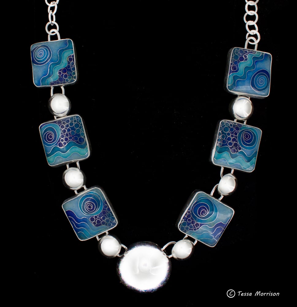 This necklace has six square cloisonné enamels (22mm x22mm) on pure silver. The settings, chain and domes are sterling silver. The central dome is 28mm in diameter. The length is adjustable, from 43 mm but it can be made longer or shorter if required. The model wearing the necklace is life-size to the scale of the necklace. This necklace is unique and completely handcrafted (with the exception of the catch) and uses the highest quality material.