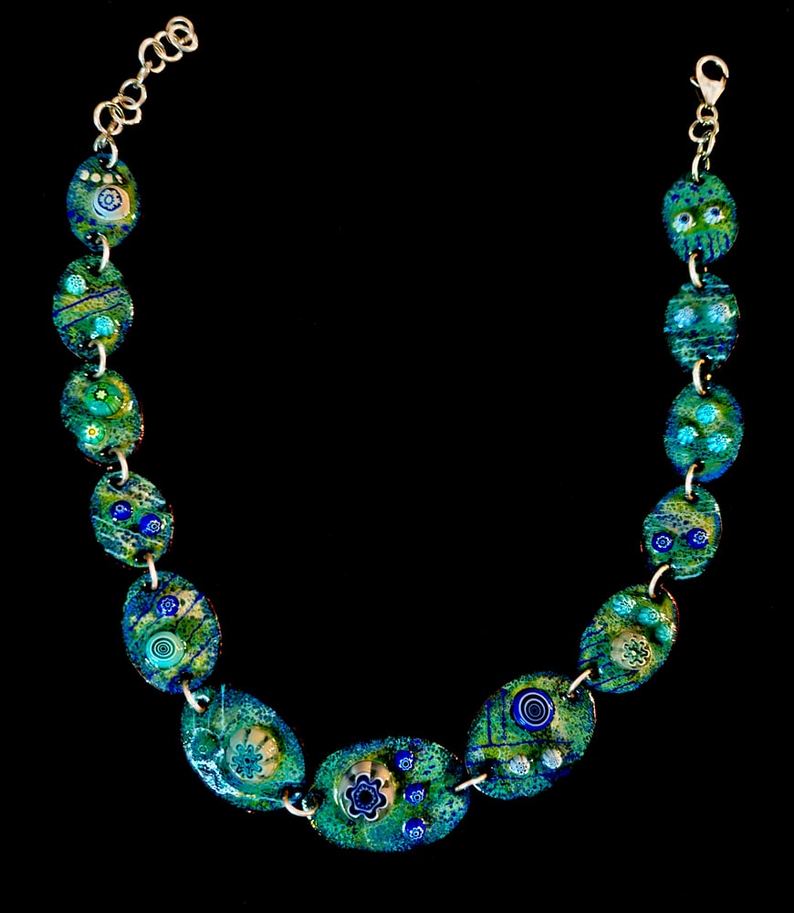 Each link of this necklace has a copper base and over a texture background there are Venetian millefiori. It has a sterling silver chain and catch. The length is adjustable form 42cm – 50cm. The necklace is unique and completely handcrafted (with the exception of the catch) and uses the highest quality material.