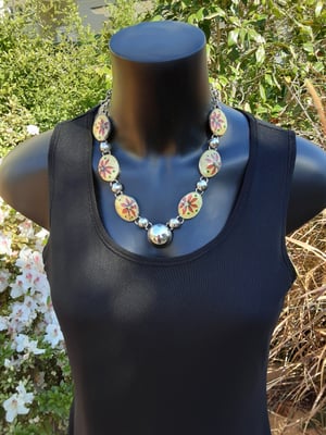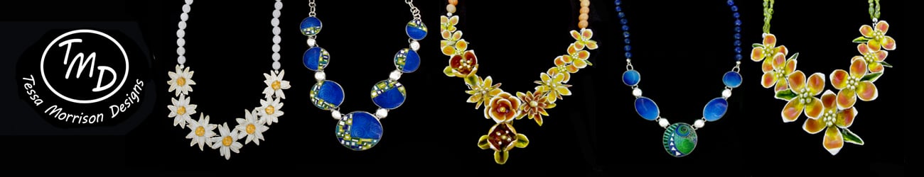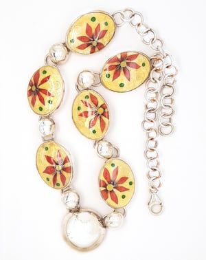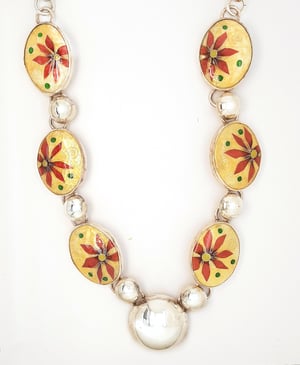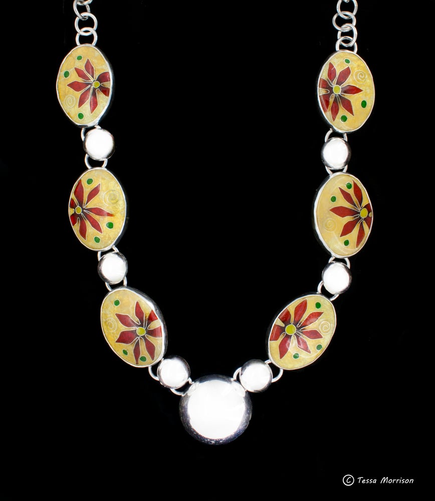 This necklace has six cloisonné enamels on 24 carat gold foil on pure silver. Nothing like the glimmer of gold under the transparent enamels it gives greater depth to the red and the transparent enamel glimmers. The settings, chain and domes are sterling silver. The length is adjustable, from 41 mm to 50 mm but it can be made longer or shorter if required. The model wearing the necklace is life-size to the scale of the necklace. This necklace is unique and completely handcrafted (with the exception of the catch) and uses the highest quality material.